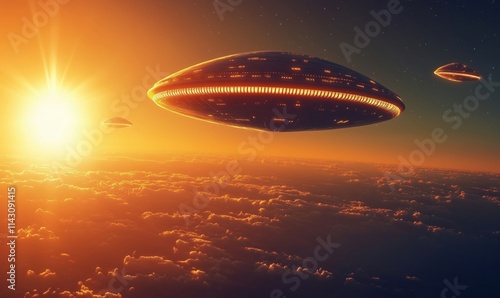 Obraz premium UFOs hovering above clouds at sunset, glowing lights, extraterrestrial...