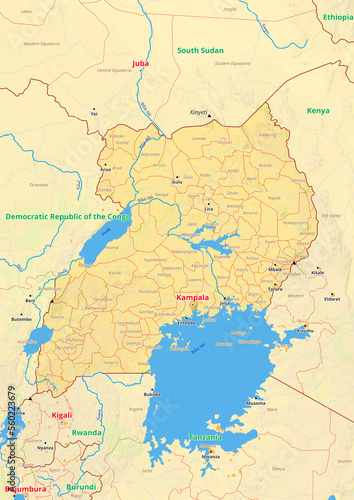 © M&M Baciu, Fototapeta premium Uganda map with cities streets rivers lakes