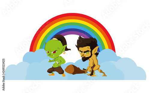 Fototapeta premium ugly troll with caveman gnome and rainbow