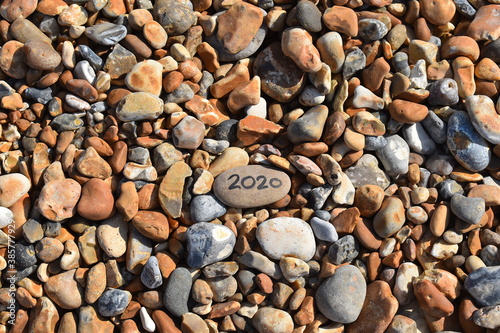 © Rusana, Naklejka premium UK holiday accommodation features huts cottages and hotels for a coastal staycation which is at high demand this year Hastings lifeguarded beach in summertime is mostly made up of sea smoothed pebbles