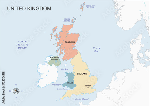 © Nea, Fototapeta premium UK Map with Soft Colored States Borders, Map of United Kingdom on Pastel Blue Background