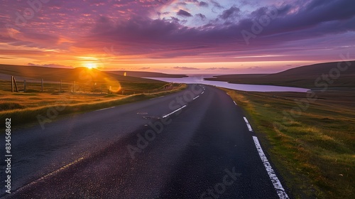 © PSCL RDL, Naklejka premium UK, Scotland, Empty asphalt road in Shetland Islands at sunset