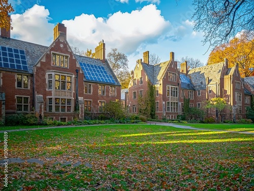 Obraz premium UK Terraced Houses with Solar Panels on Rooftops for Energy Efficiency and...