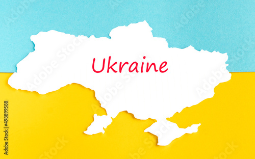Fototapeta premium Ukraine Outlines Map with Blue and Yellow Flag of Ukraine. Inscription Ukraine. High quality photo