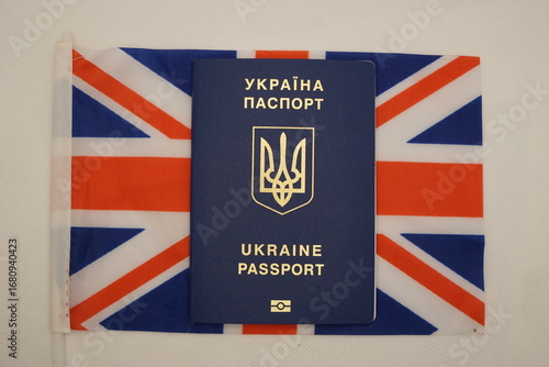 © Diana Kovalkova, Fototapeta premium ukrainian citizen's passport with the british flag in the background