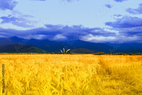 © New Africa, Obraz premium Ukrainian flag. Picturesque view of mountain landscape with yellow wheat field under blue sky