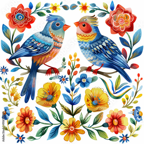 Fototapeta premium Ukranian folk art Birds on a branch with flowers watercolor generated AI