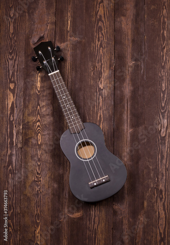Naklejka premium Ukulele black top view on a wooden background. Classic ukuleles, great design for any purpose.