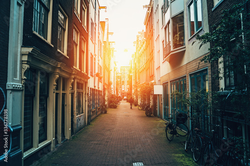 Fototapeta premium Ulica Amsterdamu, stara wąska uliczka w centrum miasta o zachodzie słońca, stonowanych