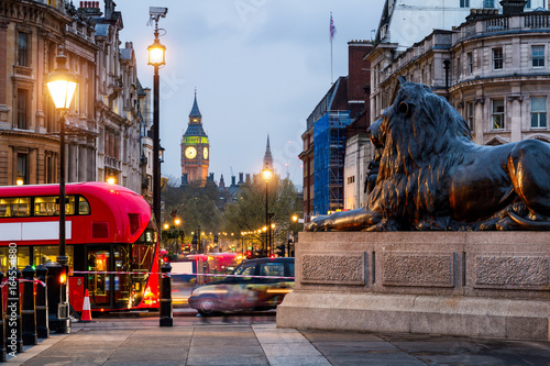 © daliu, Naklejka premium Uliczny widok Trafalgar kwadrat w kierunku Big Ben przy nocą w Londyn, UK