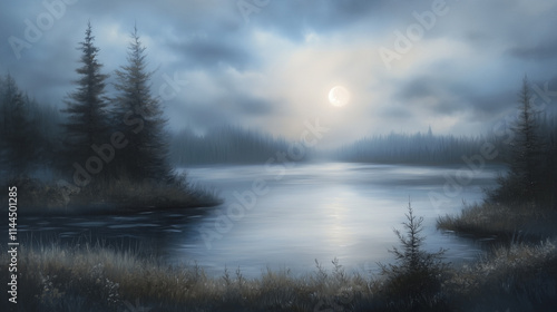 © Sawyer0, Fototapeta premium Ulotne piękno nocnego pejzażu, rozświetlonego eterycznym blaskiem księżyca, z łagodnymi, mglistymi akcentami jak w sennej wizji.