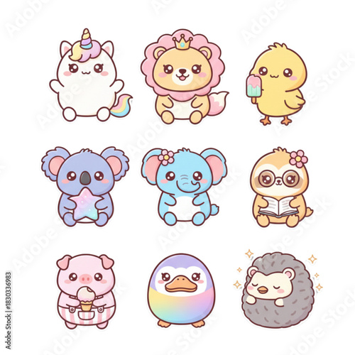 Naklejka premium Ultimate Cute Kawaii Animals Set Unicorn, Lion, Elephant and More Adorable...