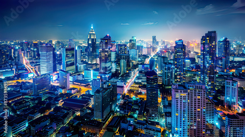 Obraz premium Ultra-detailed view of an abstract Bangkok skyline at night with bright wireless network lines connecting modern architecture deep blue sky city lights reflecting on surfaces