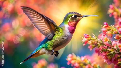 Fototapeta premium Ultra hd macro Colorful humming bird are flying near flowers and pecking at...
