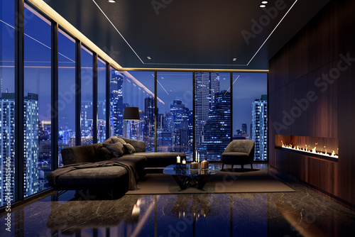 Obraz premium Ultra-luxurious, dark, and modern living room in a high-rise penthouse, featuring a stunning panoramic city skyline view at night. The room includes a contemporary fireplace and subtle linear lighting