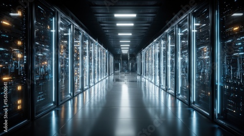 © Generative AI, Fototapeta premium Ultra Modern Data Center Corridor with Server Racks and Digital Technology.