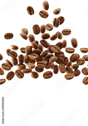 Naklejka premium ultra-photorealistic blonde roast arabica coffee beans, glossy and oily, dynamically scattering against a sterile white background with 'aroma' text copy space below, concept for premium coffee