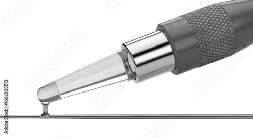 © Leo, Fototapeta premium Ultra-precise applicator tool with dark gray handle, chrome ferrule, clear silicone tip dispensing metallic silver liquid in a straight line on transparent background, high-key studio. Concept of
