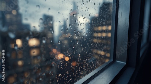 © Neon Stock, Obraz premium Ultra quality image of close-up view highlights water droplets on sleek aluminum window frames amidst a rainy atmosphere in a city environment.