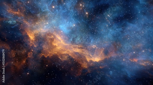 Fototapeta premium Ultra quality image of colorful nebula view showcasing vibrant gases and stars against a deep blue and orange background in a vast expanse of space captured from a distant perspective.