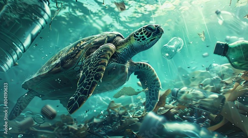 Fototapeta premium Ultra Realistic close up of sea turtle swimming among plastic bottles and...