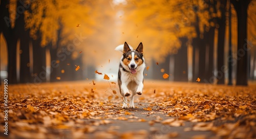 © Heartfelt , Fototapeta premium Ultra Realistic Playful Dog Running through Autumn Leaves in Park