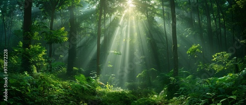 Obraz premium Ultra-sharp photo of a lush green forest with towering trees and dappled...