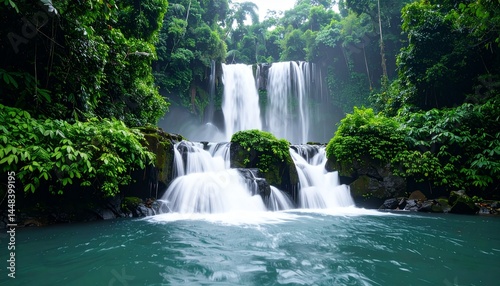 © Masrur, Naklejka premium Ultra-sharp photo of a majestic waterfall flowing through a lush rainforest, soft lighting and perfect shutter speed, visually powerful and serene