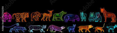 © Russell, Fototapeta premium Ultra-Wide Background of Animals in Neon Glowing Outline Style (Generative AI)