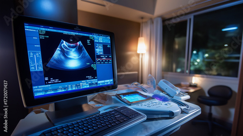 © Laura, Fototapeta premium Ultrasound screen glowing in darkened room for clearer visibility of vascular flow.