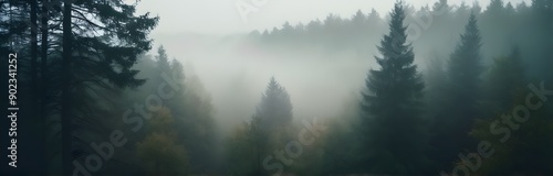 Obraz premium Ultrawide, Misty forest landscape from sky.