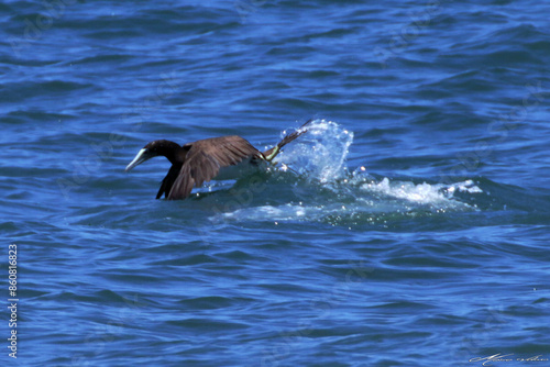 © Mrio, Fototapeta premium Um Atobá em ação pescando e levantando voo do mar em Ponta Negra - Maricá - RJ