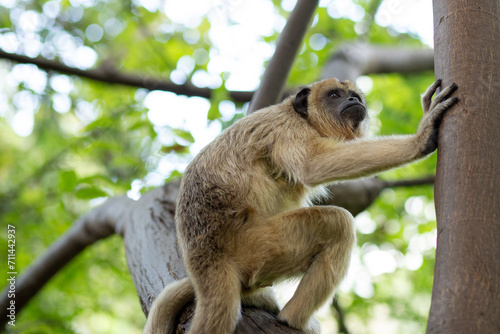 © Angela, Naklejka premium Um Macaco-bugio preto, fêmea, empoleirado em um galho de uma árvore no parque. (Alouatta caraya)