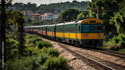 © R-CHUN, Fototapeta premium Um trem se aproximando com uma paisagem urbana movimentada ao fundo capturado em plano aberto com lente telefoto.