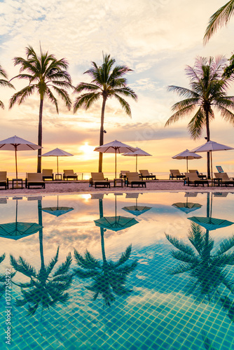 © topntp, Fototapeta premium Umbrella and chair around swimming pool in hotel resort with sunrise in morning