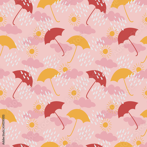 © rysunki.malunki, Obraz premium Umbrellas, clouds, rain, and suns seamless vector pattern. Springtime weather surface print design. For fabrics, stationery and packaging.