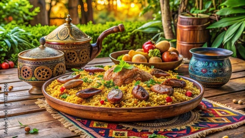 Fototapeta premium Un atractivo plato de kabsa con muslos de pollo marinados, rodeado de vajilla tradicional en un entorno al aire libre. Este plato destaca por su rica mezcla de especias y su presentación colorida, per