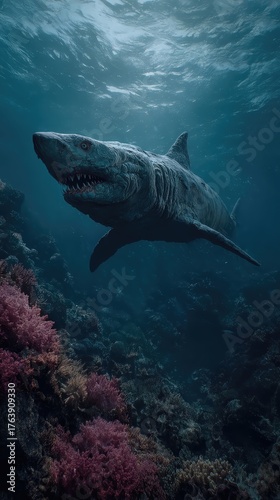 Naklejka premium Un enorme tiburón blanco emerge de la oscuridad, rodeado de vibrantes corales.