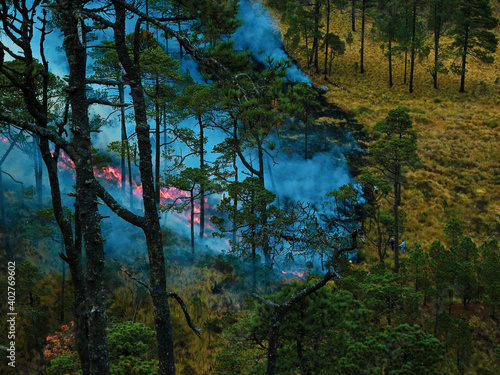 © Bernabe, Fototapeta premium Un incendio forestal iniciando y quemando mucho pastizal y bosque a su paso