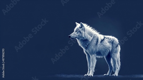 © Michela, Naklejka premium Un lupo misterioso in piedi su uno sfondo blu scuro, con spazio per il testo