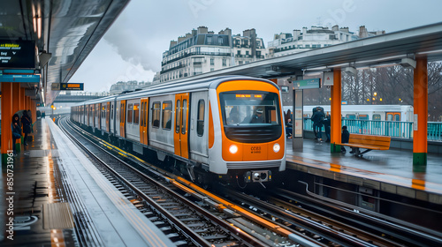 Fototapeta premium Un métro à quai dans une station urbaine par temps pluvieux, avec quelques...