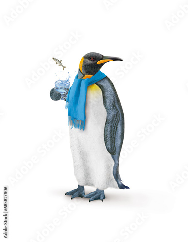 © behzadillustrations, Naklejka premium un manchot empereur avec une écharpe qui tien un verre de poisson gounjon qui s'échappe