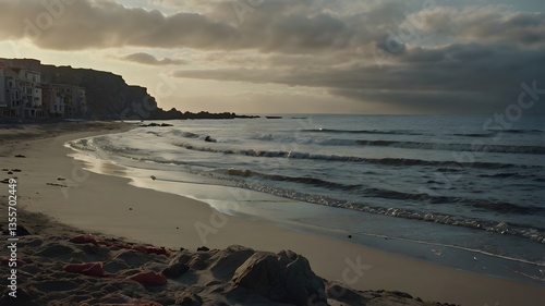 Fototapeta premium Un plano panorámico de una playa desierta al atardecer, con olas suaves...