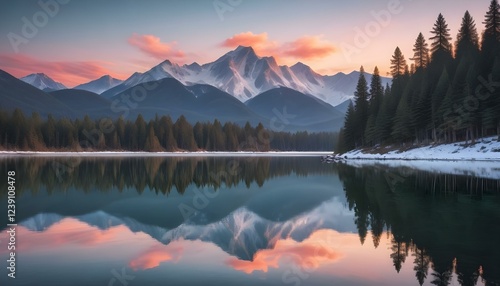 © Monster, Fototapeta premium Un sereno paisaje montañoso con picos nevados, un lago tranquilo y un vibrante cielo al atardecer. El primer plano presenta un denso bosque de pinos reflejado en las tranquilas aguas, creando una esce