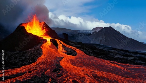 © Argiduna, Fototapeta premium Un volcán entra en erupción y ríos de magma caen por las laderas.