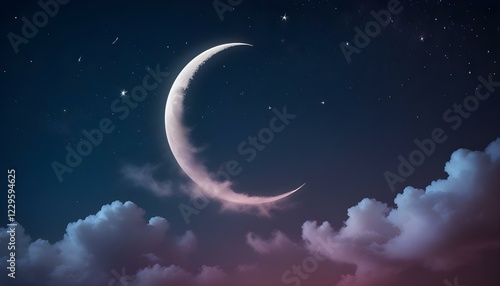 Fototapeta premium Una luna creciente en un cielo nocturno lleno de estrellas, rodeada de tenues nubes