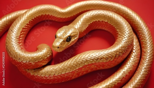 Obraz premium Una serpiente dorada enrollada sobre un fondo rojo