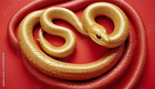 Obraz premium Una serpiente dorada enrollada sobre un fondo rojo