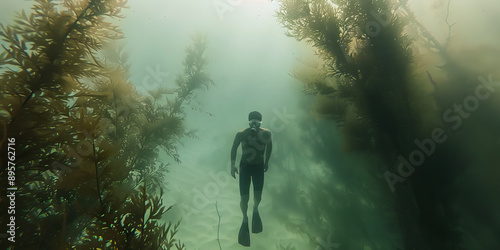 © Lila Patel, Fototapeta premium Uncharted Depths of Resilience: A lone figure swimming through murky waters, surrounded by a haze of underwater plant life.
