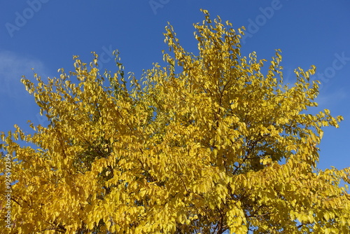 © Anna, Fototapeta premium Unclouded blue sky and autumnal foliage of mulberry tree in october